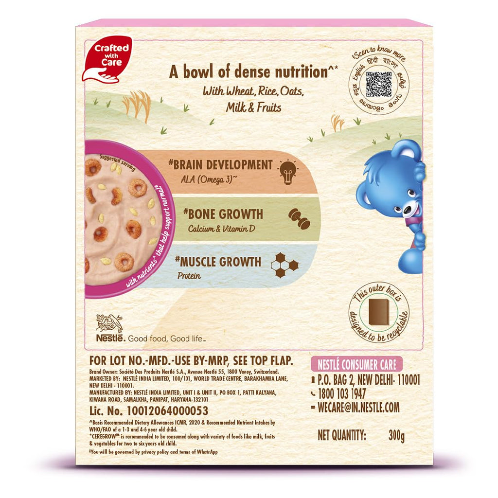 - Features a blend of wheat, rice, oats, milk, and fruits
