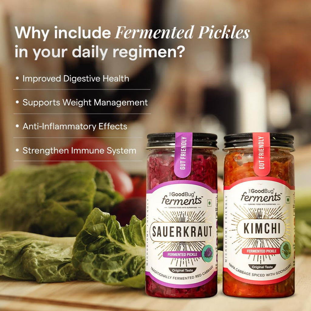 This pickles pack features Kimchi and Sauerkraut, both naturally fermented to enhance gut health. Packed with probiotics and antioxidants, these pickles are ideal for elevating your meals.